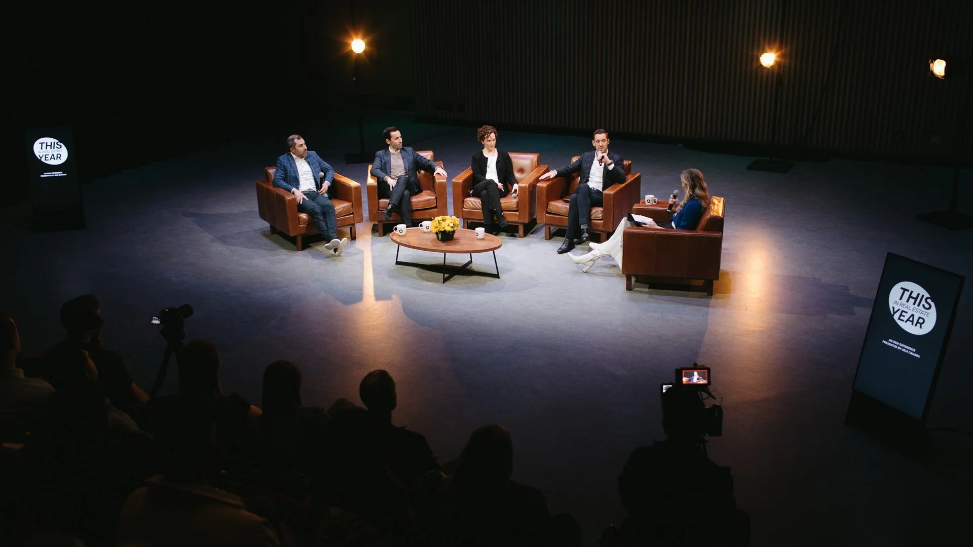 The Annex Theatre inspired the idea to reference the show “My Next Guest Needs No Introduction,” where David Letterman interviews his guests on a stage set with two armchairs and moody fresnel lights. I used this layout as a starting point, adapting it for our panel discussion format, "This Year In Real Estate."